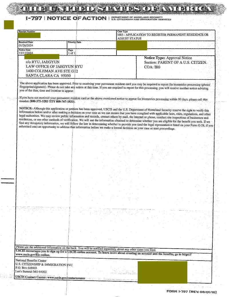 미국 시민권자 자녀가 한국인 부모를 초청하여 미국에서 영주권 신분조정 (신분변경)을 승인받은 케이스입니다.