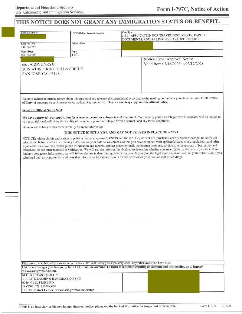 재입국 허가서 (Reentry Permit) 신청하여 승인된 케이스 (약 1년 3개월) 재입국 허가서 (Reentry Permit) 신청하여 승인된 케이스 (약 1년 3개월) 영주권을 취득한 후에 한국에 1년 이상 2년까지 머무르기 위해서 재입국허가서 (Reentry Permit)을 신청하여 승인 받은 경우입니다. 재입국 허가서 접수날짜: 2024년 11월 18일 재입국 허가서 승인날짜: 2025년 2월 18일 류재균2026-02-23T16:29:19-08:00