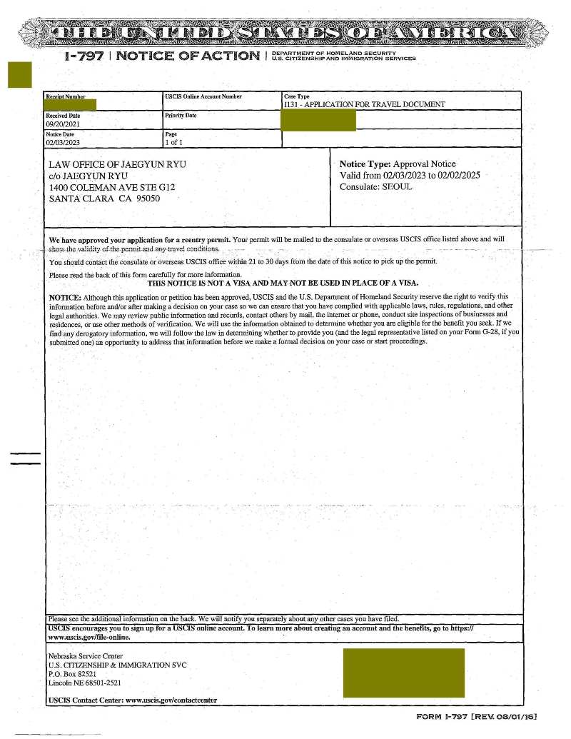 재입국 허가서 (Reentry Permit) 신청하여 승인된 케이스 (약 1년 5개월, 지문생략) 재입국 허가서 (Reentry Permit) 신청하여 승인된 케이스 (약 1년 5개월, 지문생략) 영주권을 취득한 후에 한국에 1년 이상 2년까지 머무르기 위해서 재입국허가서 (Reentry Permit)을 신청하여 승인받은 경우입니다. 재입국 허가서 접수날짜: 2021년 9월 20일 지문날인 날짜: 생략됨 재입국 허가서 승인날짜: 2023년 2월 3일 류재균2023-03-01T15:46:55-08:00