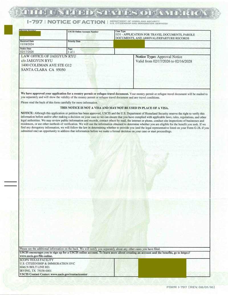 재입국 허가서 (Reentry Permit) 신청하여 승인된 케이스 (약 1년 3개월) 재입국 허가서 (Reentry Permit) 신청하여 승인된 케이스 (약 1년 3개월) 영주권을 취득한 후에 한국에 1년 이상 2년까지 머무르기 위해서 재입국허가서 (Reentry Permit)을 신청하여 승인 받은 경우입니다. 재입국 허가서 접수날짜: 2024년 11월 18일 재입국 허가서 승인날짜: 2025년 2월 17일 류재균2026-03-05T12:56:21-08:00