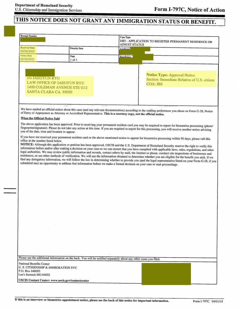 미국 시민권자와 결혼하여 미국에서 영주권으로 신분조정 (신분변경, Adjust of Status)를 신청한 경우입니다. 이 케이스는 신청부터 승인까지 약 9개월이 걸려서 승인되었습니다. 영주권이 승인되는 시점이 결혼하신 지 2년이 넘어서 일반 영주권(IR6)을 받으셨습니다.