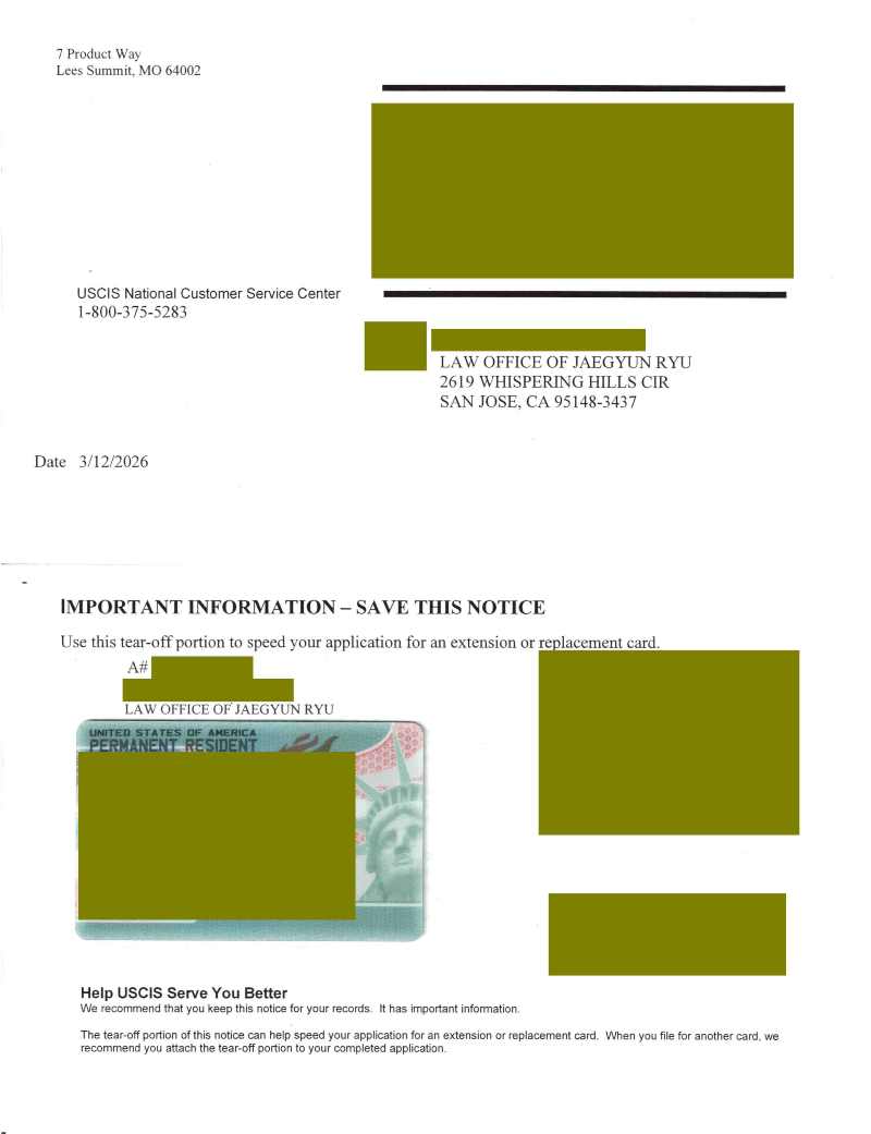 영주권 갱신 신청하여 승인된 케이스 (약 4개월) 영주권 갱신 신청하여 승인된 케이스 (약 4개월) 영주권 갱신 신청을 하여 승인받은 케이스입니다. 영주권 갱신 서류 접수 날짜: 2025년 11월 17일 승인 날짜: 2026년 3월 12일 * 승인서는 못받았으며, 갱신된 영주권 카드를 받았습니다. 류재균2026-03-18T09:58:46-07:00