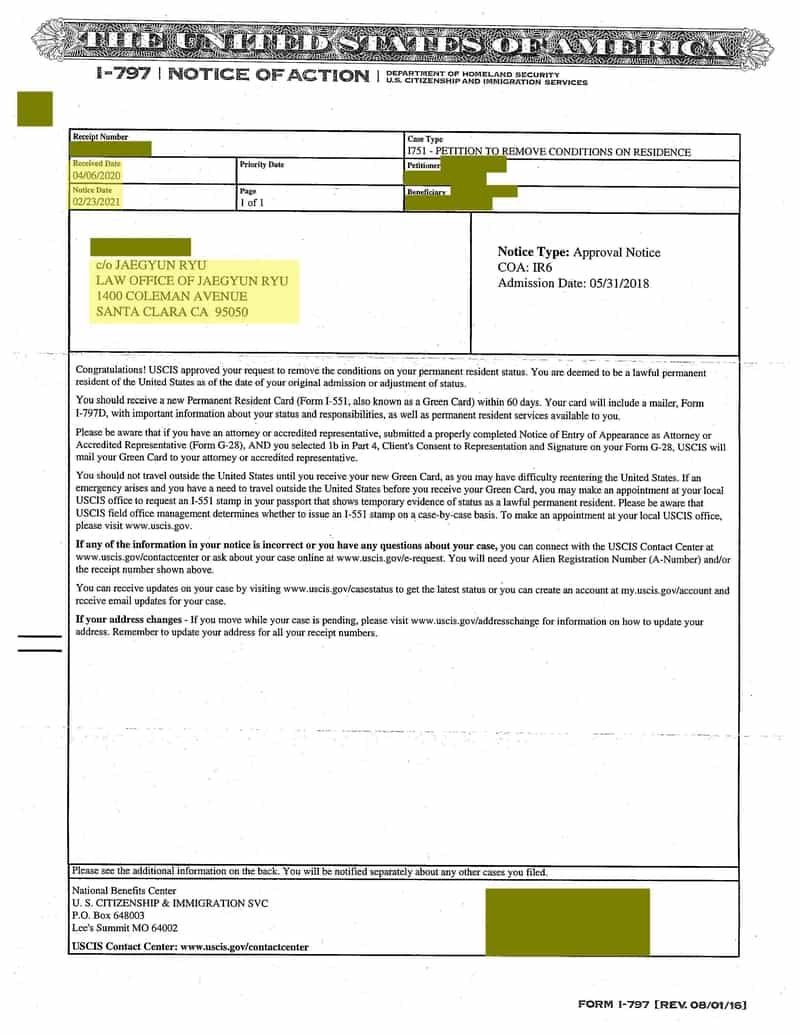 미국 시민권자와 결혼하여 영주권을 승인받았을 때 결혼 기간이 2년 미만이면 유효기간이 2년인 조건부 영주권을 받게 됩니다. 이때 유효기간이 만기 되기 전에 조건부 영주권 해지신청을 하여야 하며 승인되면 유효기간이 10년인 영주권을 받게 됩니다. 아래 승인서 사본이 조건부 해지신청을 하여 승인받은 경우입니다.