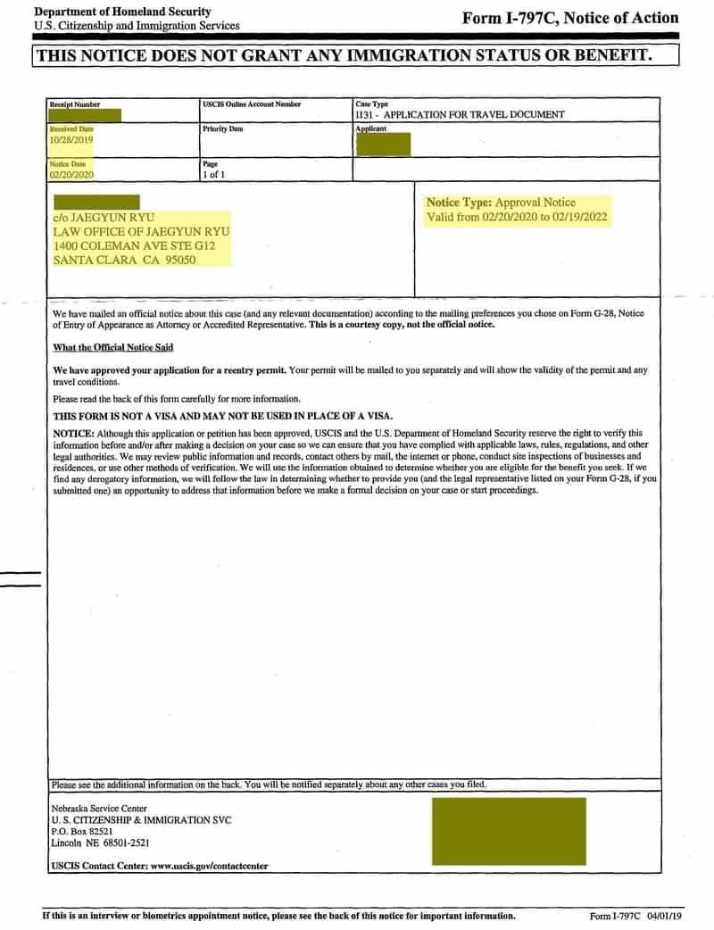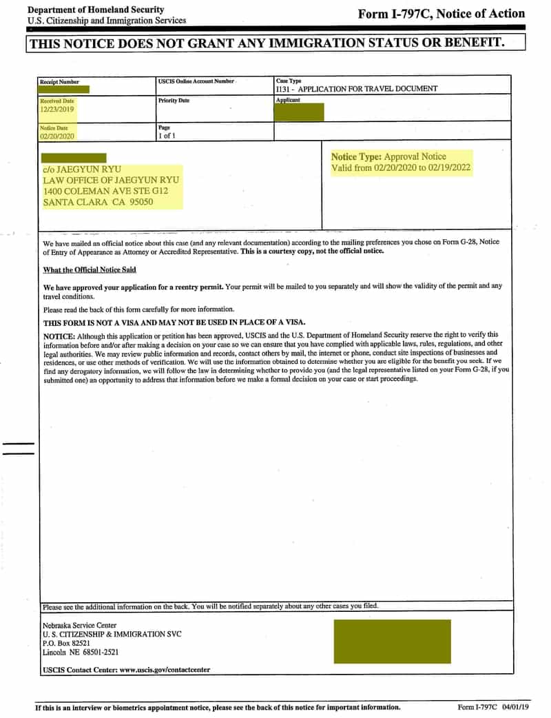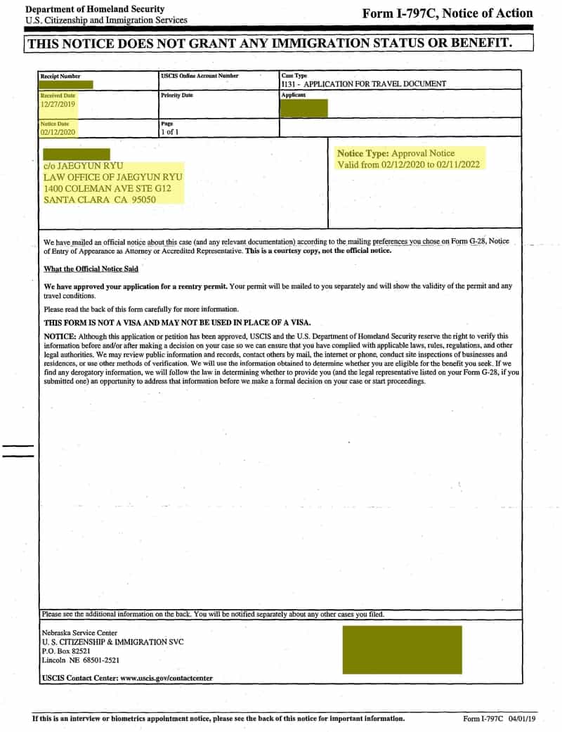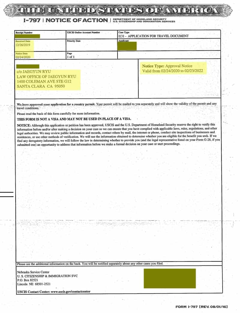영주권을 취득한 후에 한국에 1년 이상 2년까지 머무르기 위해서 재입국허가서 (Reentry Permit)을 신청하여 승인받은 경우입니다.