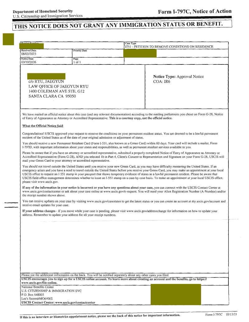 조건부 영주권 해지 승인 날짜: 2026년 3월 19일