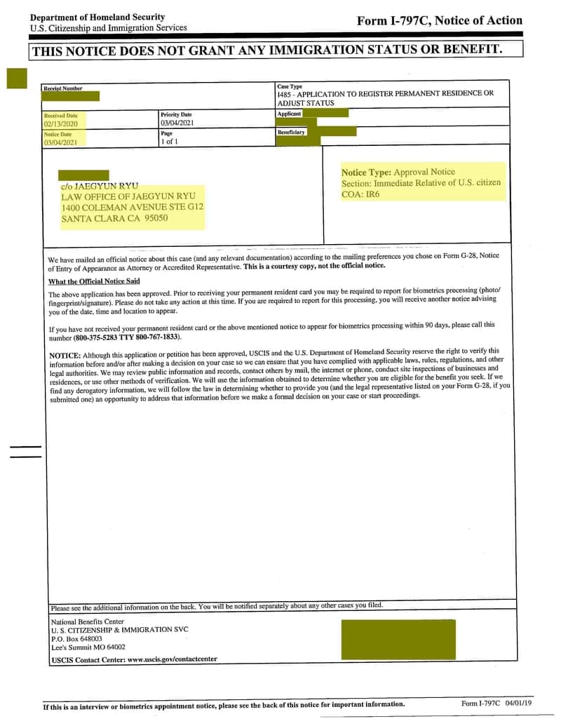 미국 시민권자와 결혼하여 미국에서 영주권으로 신분조정 (신분변경, Adjust of Status)를 신청한 경우입니다. 이 케이스는 신청부터 승인까지 약 1년 1개월이 걸려서 승인되었습니다. 영주권이 승인되는 시점이 결혼하신 지 2년이 넘어서 일반 영주권(IR6)을 받으셨습니다.
