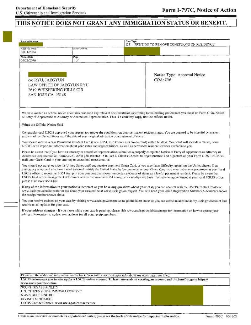 조건부 영주권 해지 승인 날짜: 2026년 4월 22일