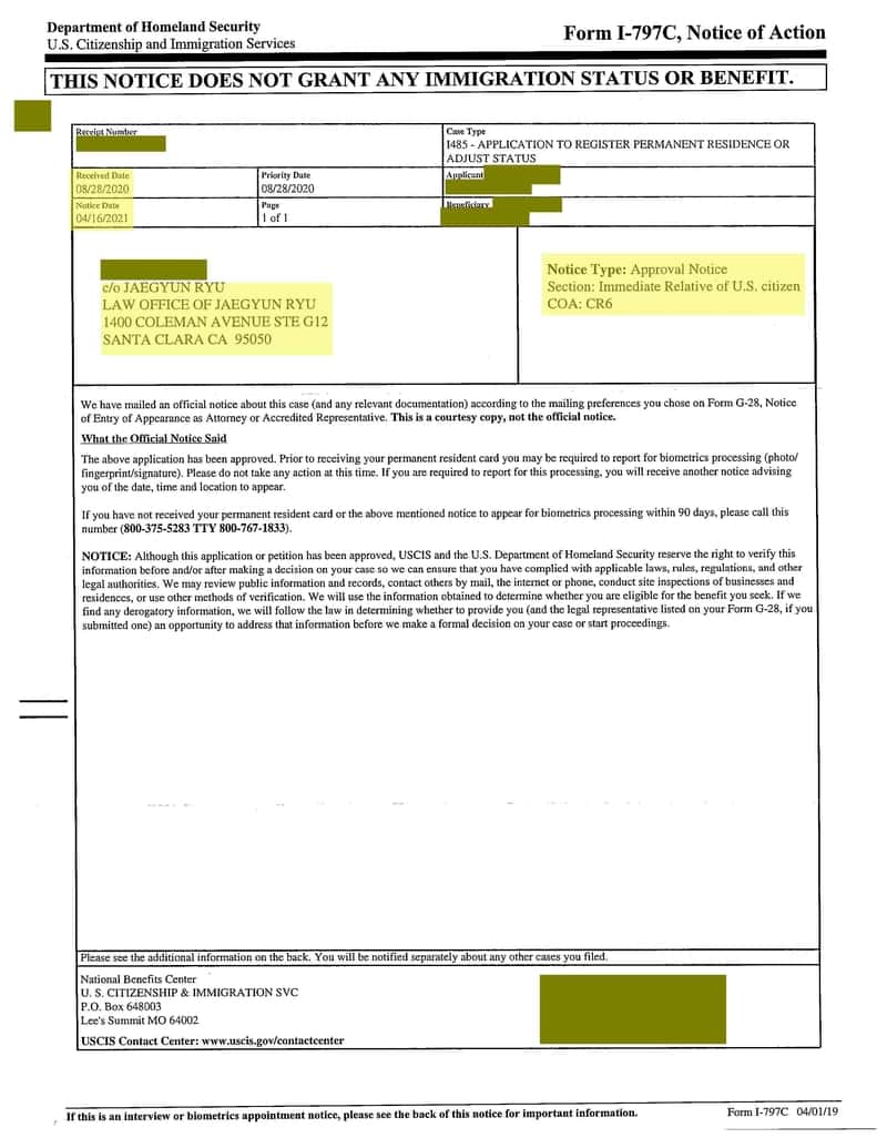 영주권 승인 날짜: 2021년 4월 16일
