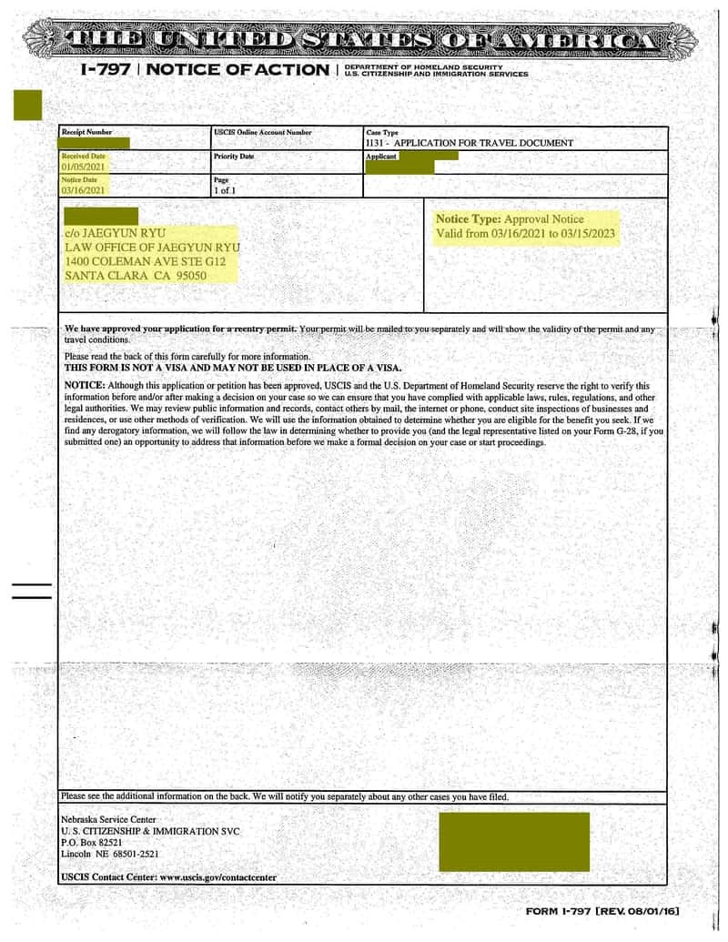 재입국 허가서 승인날짜: 2021년 3월 16일