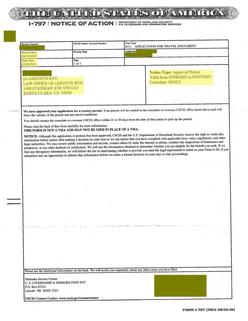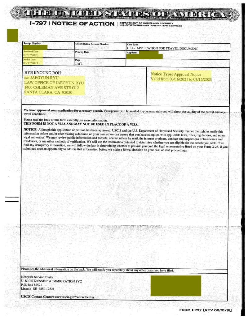 영주권을 취득한 후에 한국에 1년 이상 2년까지 머무르기 위해서 재입국허가서 (Reentry Permit)을 신청하여 승인받은 경우입니다.