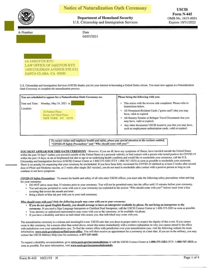 시민권 인터뷰 날짜 & 장소: 2021년 5월 6일, New York, NY