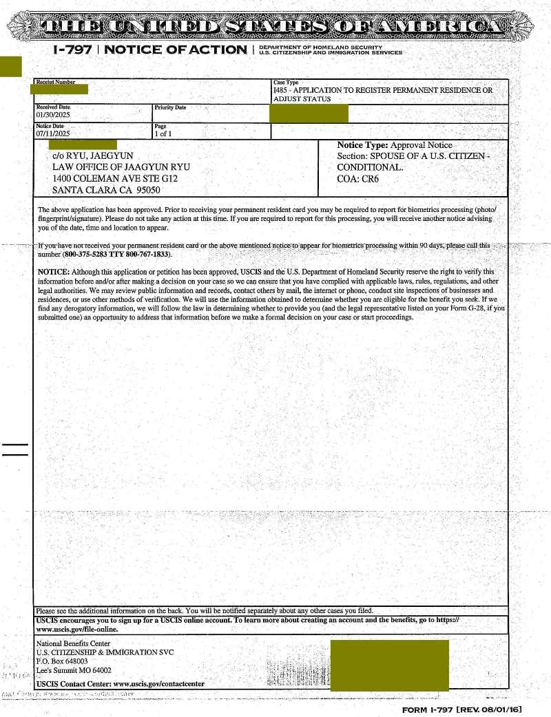 미국 시민권자와 결혼하여 결혼 영주권 미국에서 영주권으로 신분조정 (신분변경, Adjust of Status)으로 승인된 경우입니다.