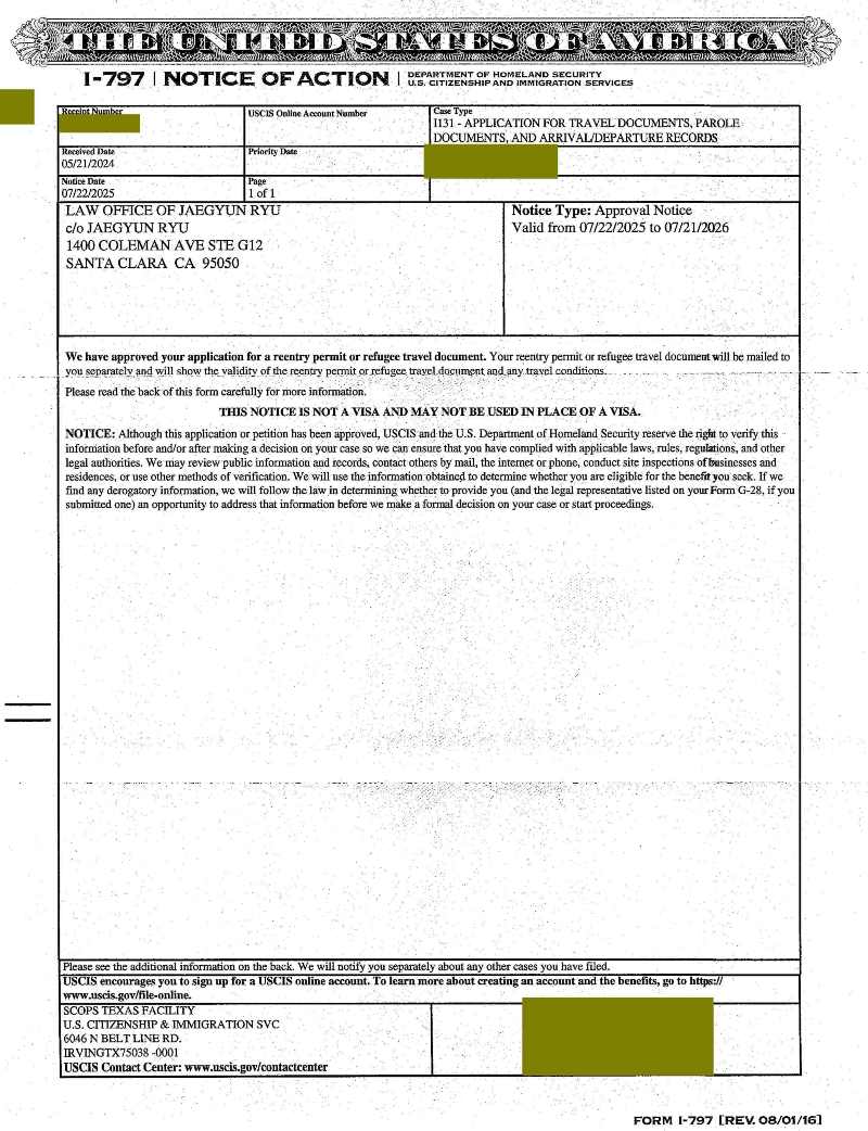 재입국 허가서 승인날짜: 2025년 7월 22일