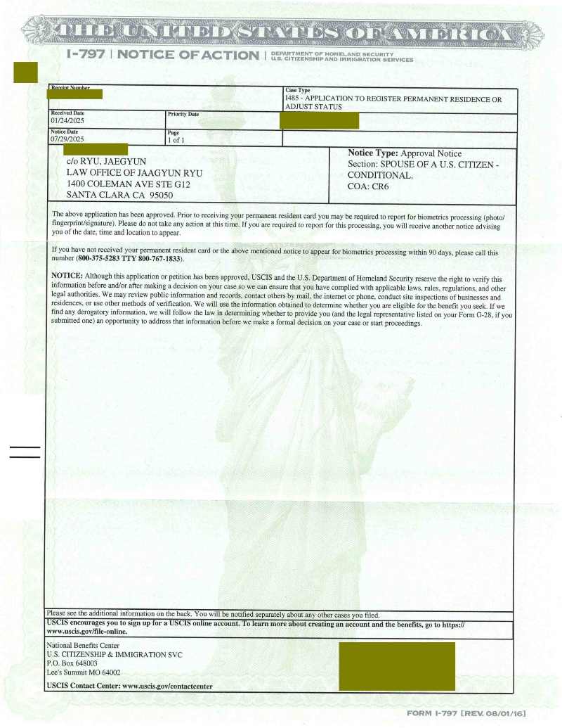 미국 시민권자와 결혼하여 결혼 영주권 미국에서 영주권으로 신분조정 (신분변경, Adjust of Status)으로 승인된 경우입니다.