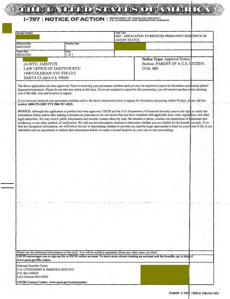 미국 시민권자 자녀가 한국인 부모를 초청하여 미국에서 영주권 신분조정 (신분변경)을 승인받은 케이스입니다.