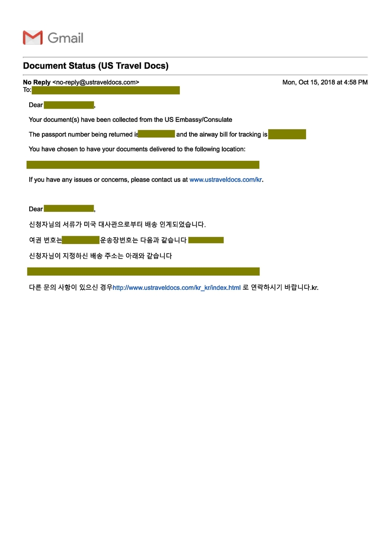 미국 시민권자와 약혼으로 약혼 비자를 승인받은 경우입니다. 약혼비자가 배달되면서 주한 미국 대사관에서 이메일로 알려주는데 그 이메일을 아래에 첨부하였습니다.