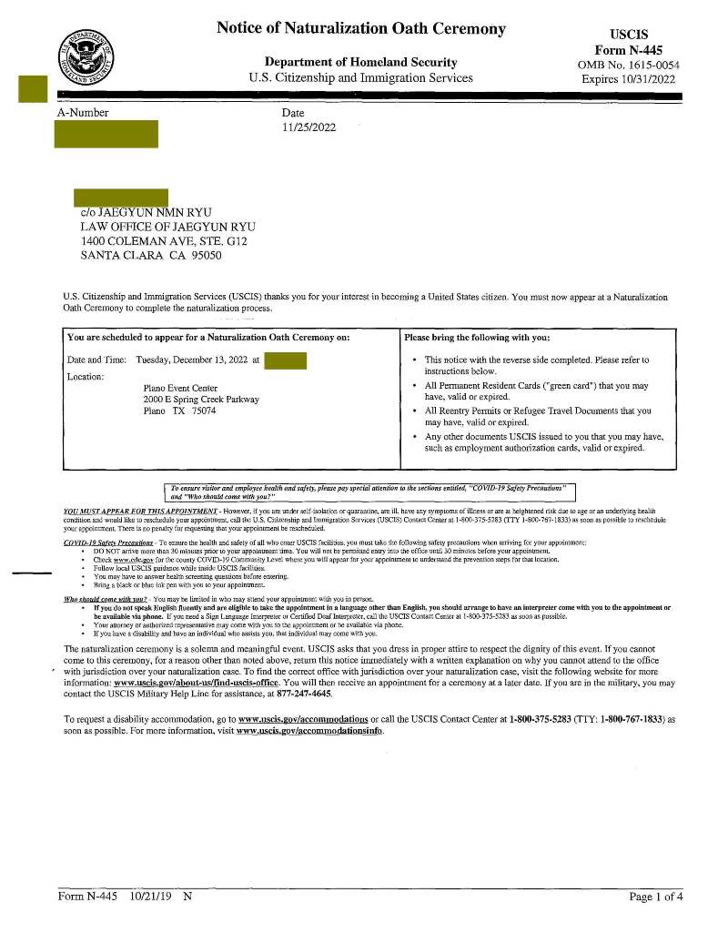 시민권 신청을 하여 승인된 케이스 (약 5개월) 시민권 신청을 하여 승인된 케이스 (약 5개월) 미국에서 시민권을 신청하여 승인된 케이스입니다. 시민권 신청한 날짜: 2022년 7월 22일 시민권 인터뷰 날짜 & 장소: 2022년 11월 22일, Irving, TX 시민권 선서식 날짜: 2022년 12월 13일 * 개인정보는 삭제하였습니다. 류재균2022-12-14T12:41:59-08:00