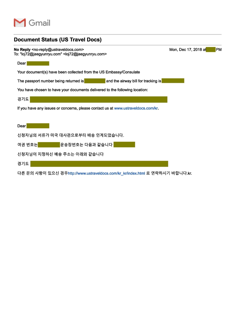 미국 시민권자와 약혼으로 약혼 비자를 승인받은 경우입니다. 아래의 이메일은 주한 미국 대사관이 약혼비자를 우편으로 신청자에게 보내주면서 보내주는 이메일입니다.