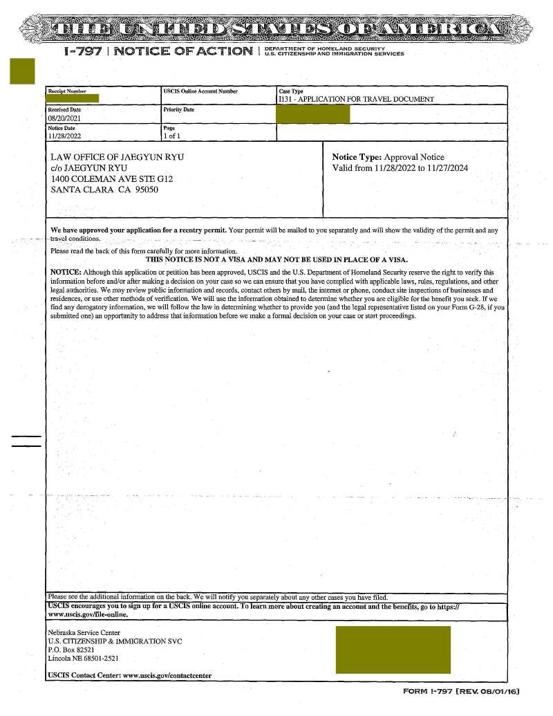 재입국 허가서 (Reentry Permit) 신청하여 승인된 케이스 (약 1년 3개월, 지문생략) 재입국 허가서 (Reentry Permit) 신청하여 승인된 케이스 (약 1년 3개월, 지문생략) 영주권을 취득한 후에 한국에 1년 이상 2년까지 머무르기 위해서 재입국허가서 (Reentry Permit)을 신청하여 승인받은 경우입니다. 재입국 허가서 접수날짜: 2021년 8월 20일 지문날인 날짜: 생략됨 재입국 허가서 승인날짜: 2022년 11월 28일 류재균2022-12-21T11:04:14-08:00