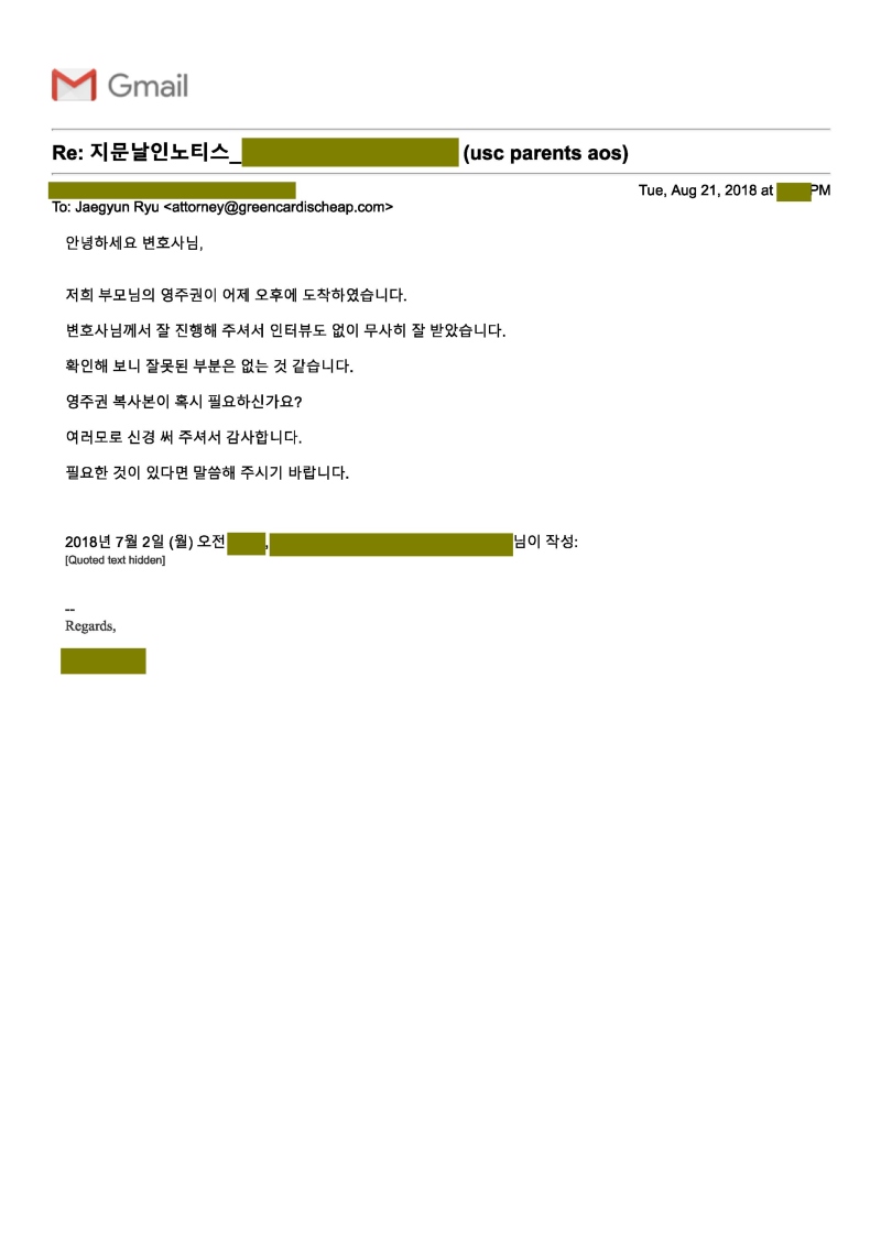 아래 케이스는 미국 시민권자 자녀분이 미국에 놀러 오신 부모님을 초청해서 두 분이 모두 영주권이 승인된 케이스인데 노동허가서도 나오기 전에 인터뷰도 생략되어 거의 4개월 만에 영주권 카드를 받으셨습니다. 이렇게 승인이 빠르게 될 때 저희가 승인서를 받기 전에 영주권을 받으시는 경우가 종종 발생합니다.  아래 이메일에 적어주신것 처럼 저희도 이 이메일을 받고 나서야 승인된것을 알게 되었습니다.