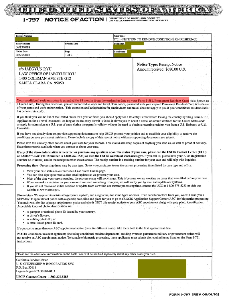 조건부 해지가 접수되었을때 이제는 1년이 아닌 18개월 연장 최근까지 조건부 영주권 해지 신청후에 받게 되는 접수증은 조건부 영주권의 유효기간을 1년 연장하여 주었습니다. 최근에 들어서 조건부 해지 신청서의 처리기간이 종종 1년을 넘게 되어서 이민국에서 1년 연장이 아닌 1년 6개월을 연장해 주기 시작하였습니다. 이로써 1년이 넘어갈때 이민국을 방문해서 영주권 도장 (또는 스티커)를 발급 받아야 하는 불편함이 없어 졌습니다. 류재균2021-04-03T03:15:55-07:00