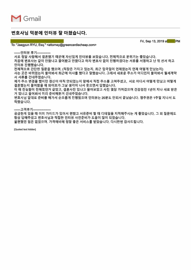 시민권자와 결혼하여 미국에서 영주권 신청하여 승인된 케이스, 고객후기 미국 시민권자와 결혼해서 미국에서 영주권 신청하셨다가 승인되신 고객분이 고객 후기를 적어주셔서 공유합니다. 류재균2021-04-03T03:13:19-07:00
