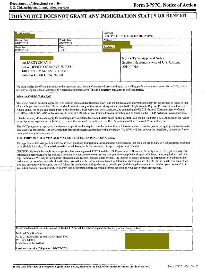 미국 시민권자와 결혼하여 미국에서 영주권으로 신분조정 (신분변경, Adjust of Status)를 신청한 경우입니다. I-485 승인서 오른쪽 윗부분에 “CR6″라고 표시되있는 코드가 시민권자와 결혼하여 조건부 영주권을 받았다는 이민국 코드입니다.